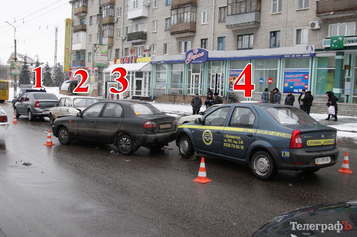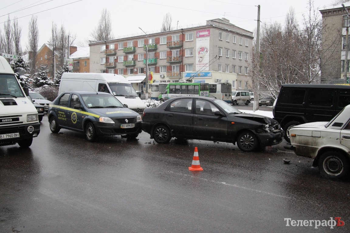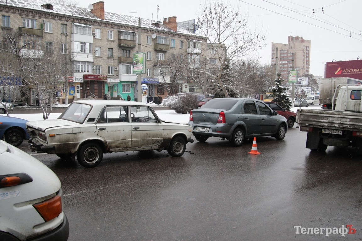 В Кременчуге, в районе мемориала «Вечно живым», около 11.00 произошло ДТП. Столкнулись 4 автомобиля — 2 Renault Logan, ВАЗ-2106 и Daewoo Lanos.