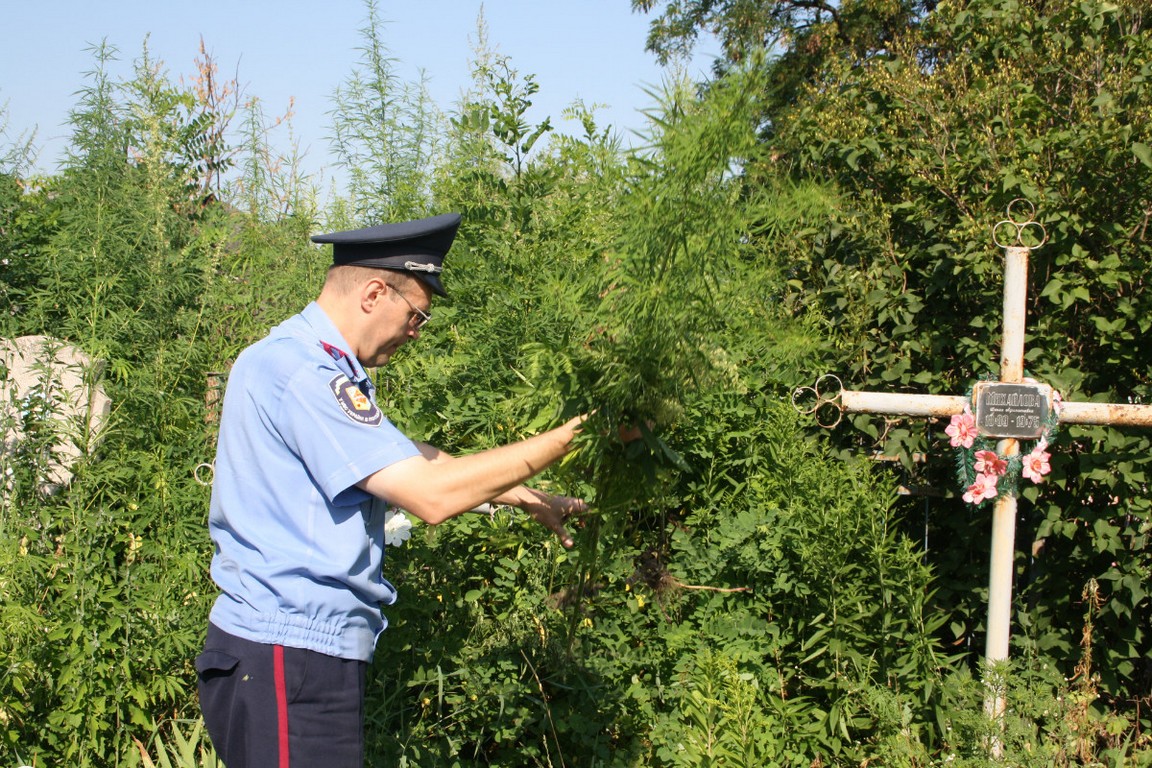 По ее данным, участковые инспекторы во время работы на микрорайоне получили информацию о, том, что на кладбище по улице Котлова высажено две плантации конопли.