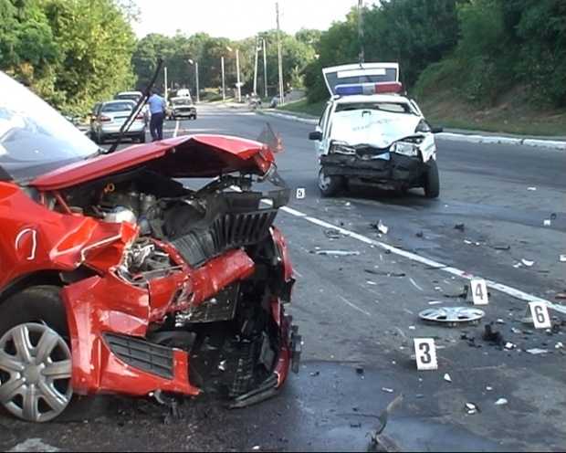 В Лубнах пьяный водитель протаранил автомобиль ГАИ. Как сообщает пресс-служба Полтавского областного управления ГАИ, ДТП произошло 8 июля около 05.00 утра. 30-летний местный житель на Skoda Roomster не справился с управлением и выехал на полосу встречного движения, где в лобовую врезался в автомобиль дорожной патрульной службы ГАИ «ВАЗ-2109». После аварии, молодой человек убежал, оставив в салоне 19-летнюю девушку и 30-летнего товарища – у них были сломаны кости ног, переломы рёбер. В авто ДПС также пострадали люди: у 42-летнего инспектора ГАИ была сломана нога, у его 26-летнего напарника – сотрясение головного мозга и ушиб грудной клетки.