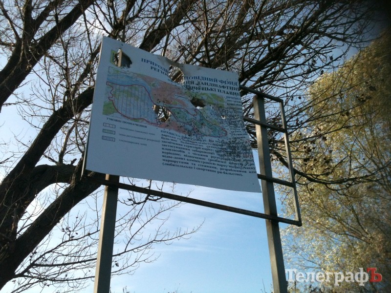 В «Кременчугских плавнях» неизвестные расстреляли охранные знаки. Как сообщил начальник отдела охраны регионального ландшафтного парка Игорь Белобров, «расстрел» произошёл на прошлых выходных, практически сразу после установки новых информационных аншлагов.