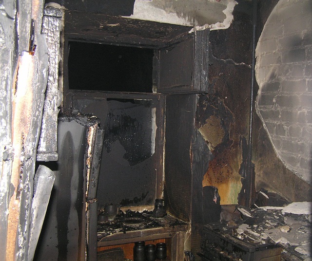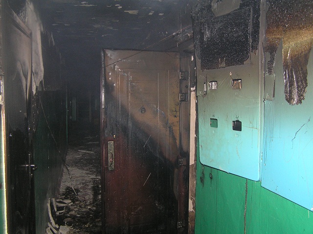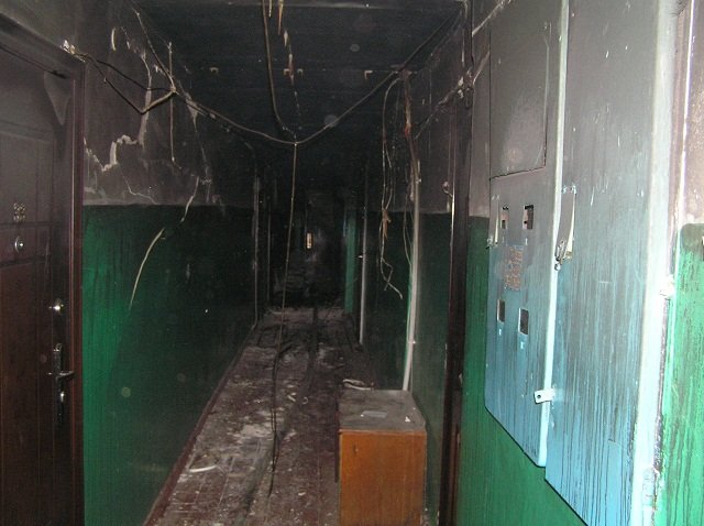 Огнем уничтожено квартиру, повреждены 3 электрощита, 10 входных дверей, закопчены стены и потолок на этаже.