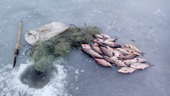 Рыбак незаконно выловил 17,5 кг рыбы. Весь улов, а также пешню* и сетку изъяла «водная» милиция.