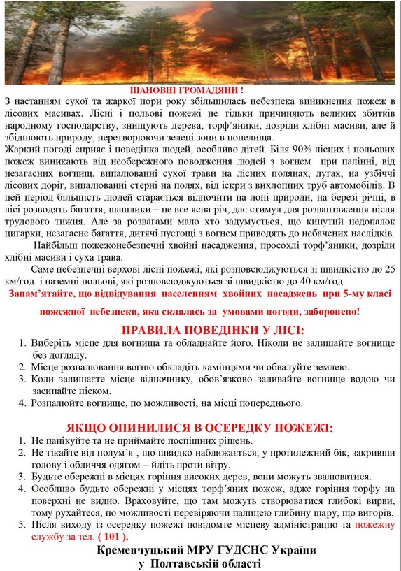 Предупреждение о пожароопасности опубликовало Кременчугское управление ГСЧС. Памятка для горожан призывает к ответственности в обращении с огнём. Это касается, в первую очередь, отдыхающих, которые устраивают пикники на природе.