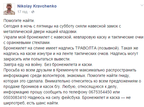Учора кременчужанин–учасник АТО Микола Кравченко повідомив, що з комори його будинку викрали бронежелет 5-го класу та особисті речі, які він використовував на службі в АТО.