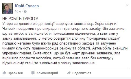 Инцидент произошел в Хороле. В полицию обратился местный житель и сообщил о том, что его машину угнали. Мужчина рассказал правоохранителям, что оставил автомобиль открытым и с ключами в замке зажигания. Чтобы оперативно раскрыть преступление, на поиски автомобиля отправили немало правоохранителей района и всей Полтавской области.