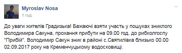 2 вересня, близько півночі, в районі с.Святилівка зник градижчанин Володимир Сакун. Про це на своїй сторінці у Facebook повідомив градизький селищний голова Мирослав Носа.