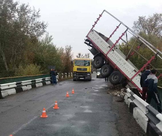 Грузовик снес ограждение и передней частью очутился в реке, а задней завис на мосту.