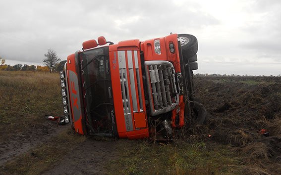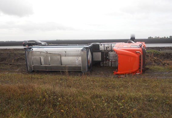 Водитель автомобиля DAF съехал с дороги и перевернулся. Мужчина не пострадал.