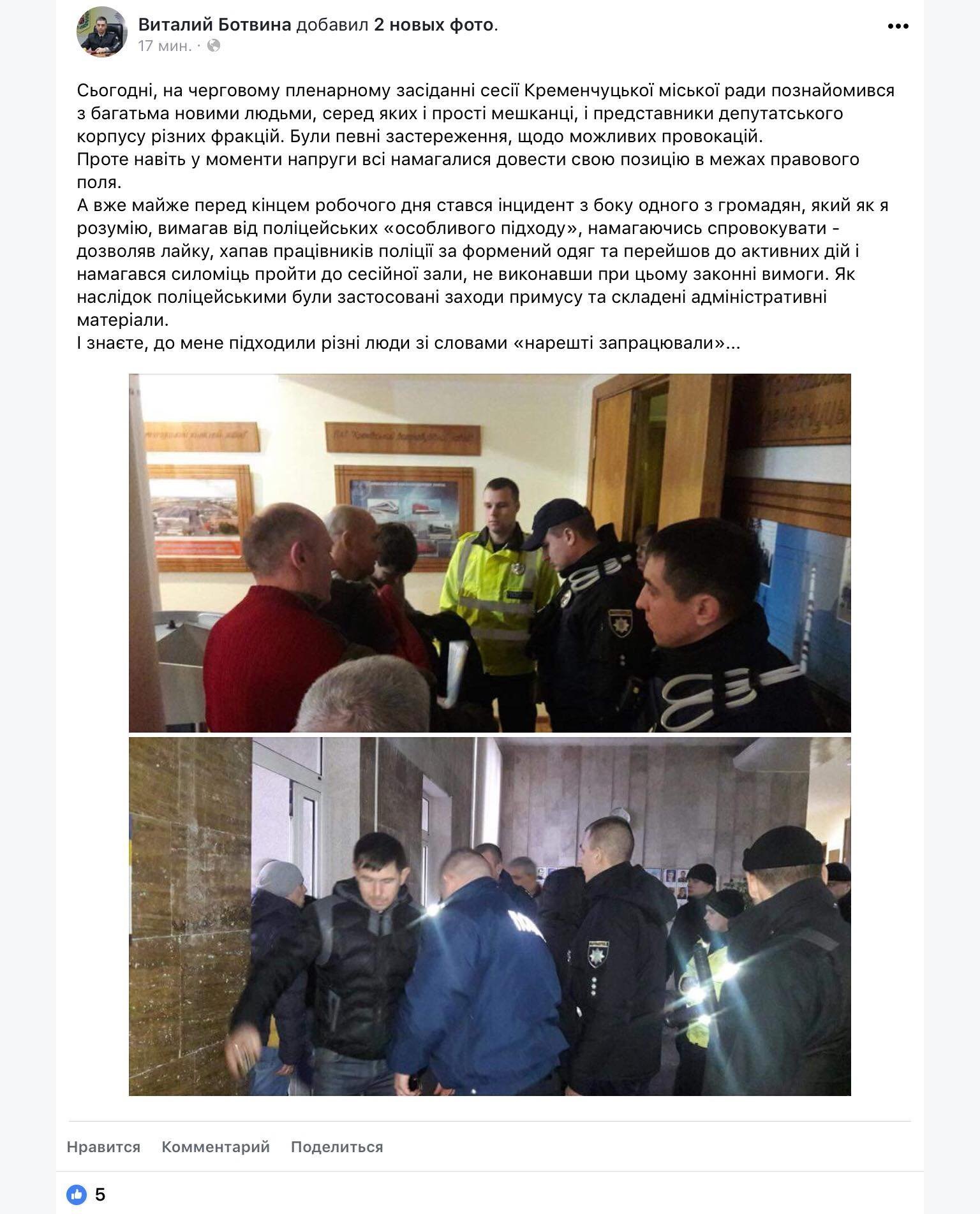 А вже майже перед кінцем робочого дня стався інцидент з боку одного з громадян, який як я розумію, вимагав від поліцейських «особливого підходу», намагаючись спровокувати – дозволяв лайку, хапав працівників поліції за формений одяг та перейшов до активних дій і намагався силоміць пройти до сесійної зали, не виконавши при цьому законні вимоги. Як наслідок поліцейськими були застосовані заходи примусу та складені адміністративні матеріали.