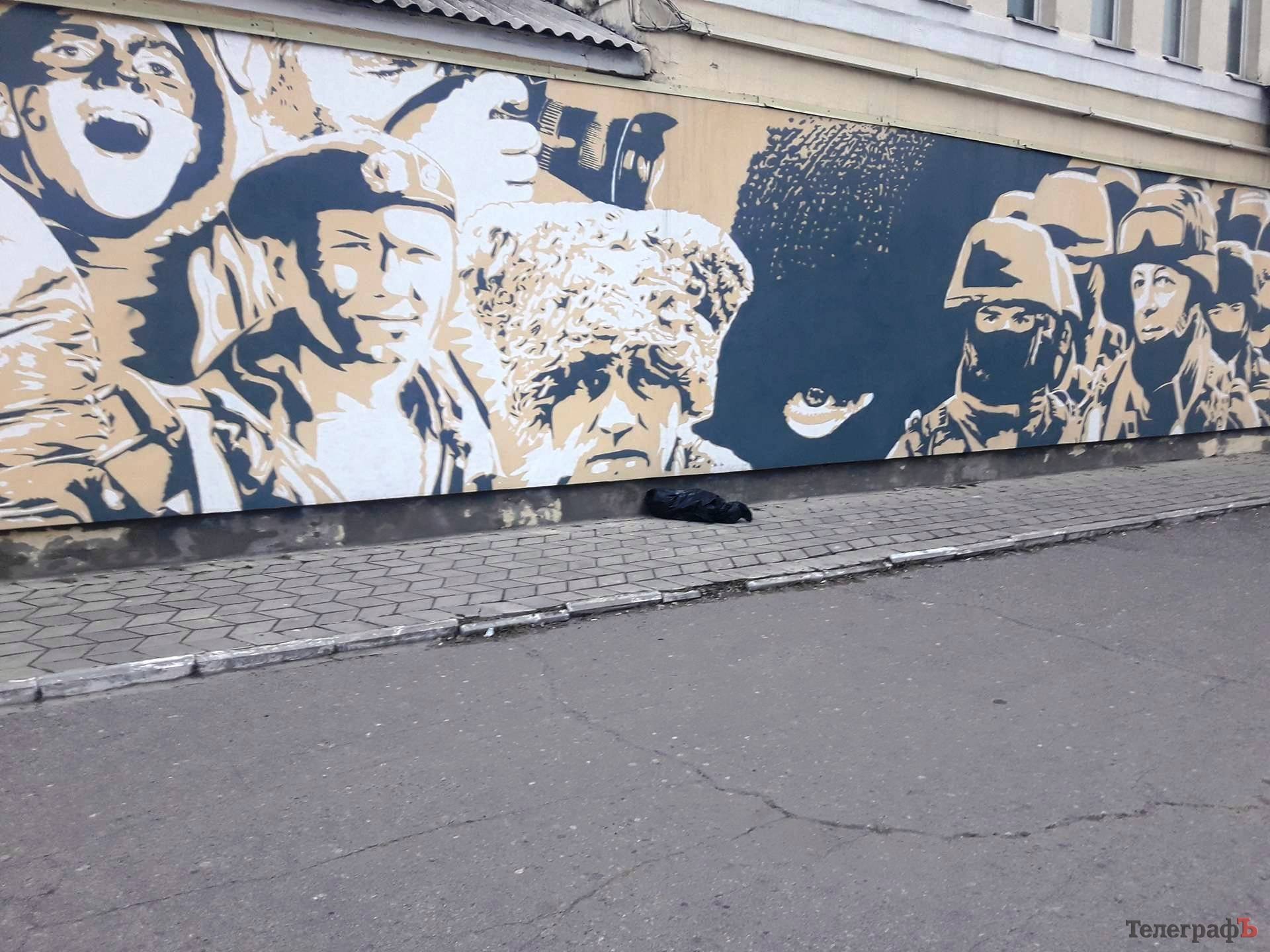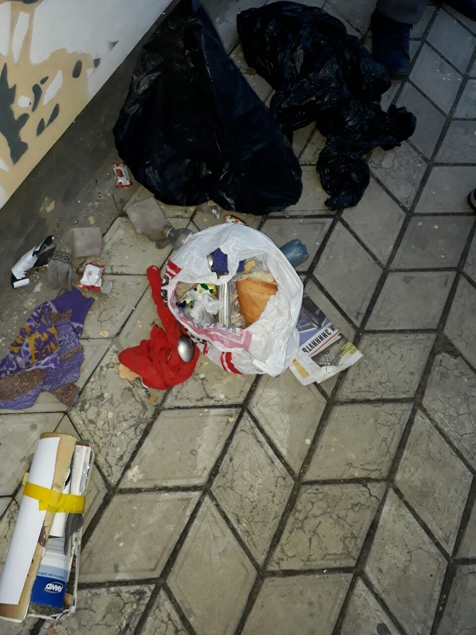 Пакет черный и увесистый. Лежит прямо возле мурала «Взгляд».