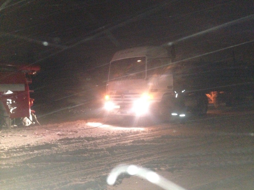 Следующий грузовик застрял на ул. Вадима Пугачева в 23.00. Водитель сам вызвал ГСЧСников, чтобы не собиралась пробка.