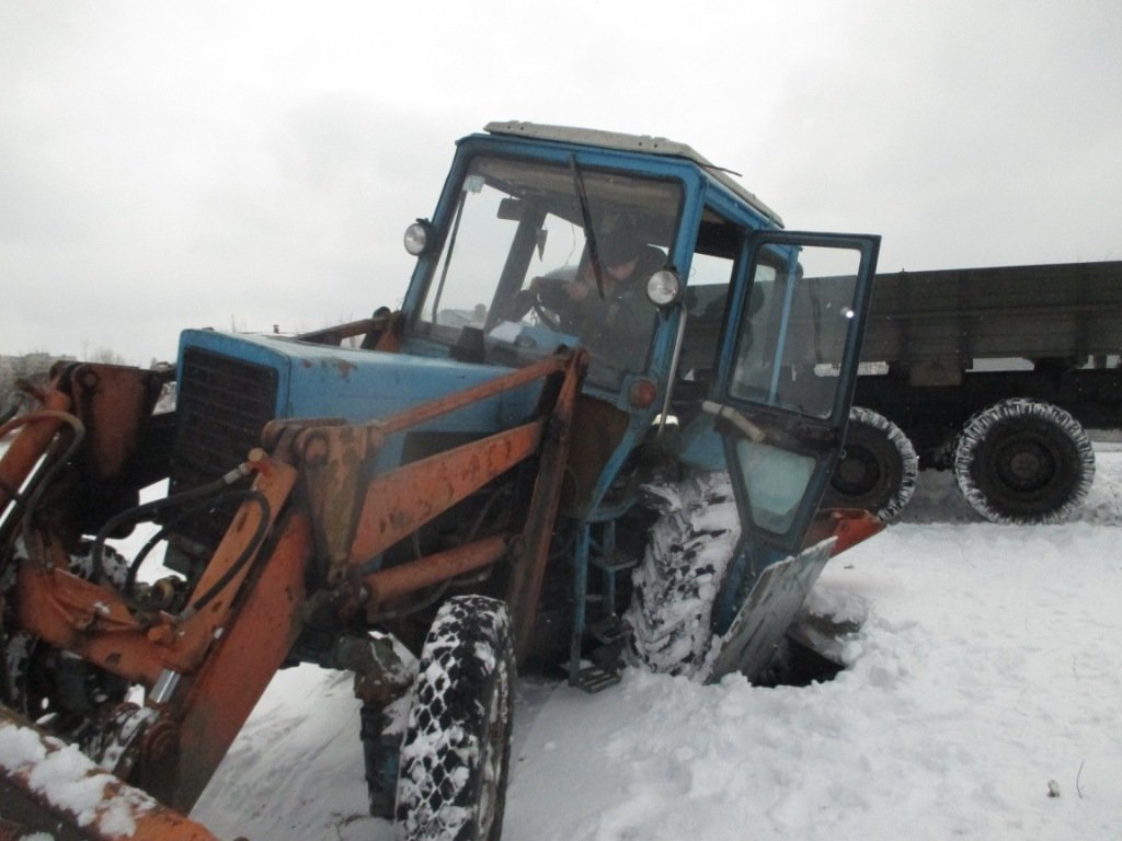 Трактор застрял колесом в отвервстии технического люка и не смог выехать. С помощью тросса спасатели вытащили трактор.