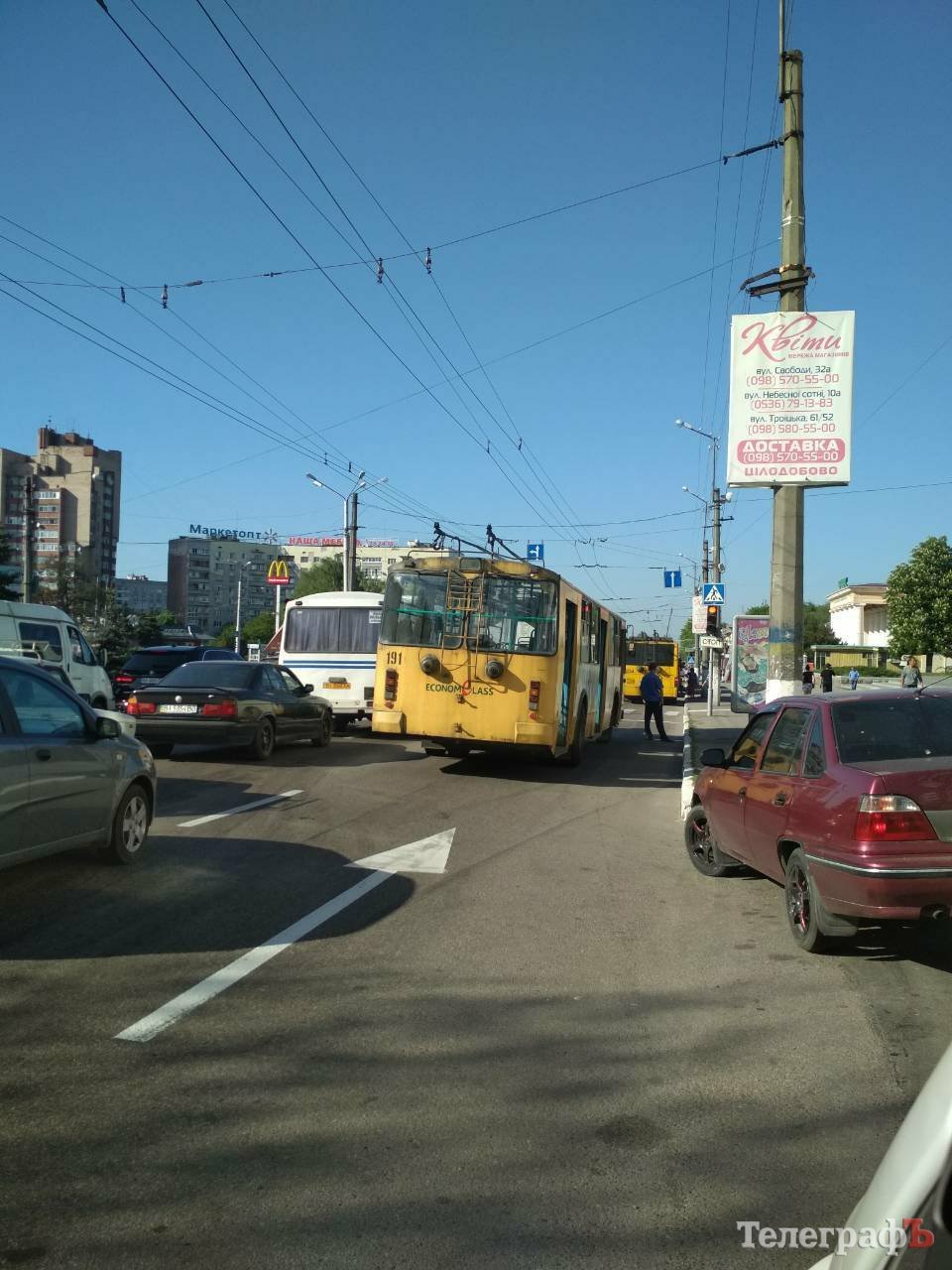 Причина неудобств – обрыв троллейбусных проводов. Из-за этого остановились троллейбусы, а вместе с ними и остальной транспорт.