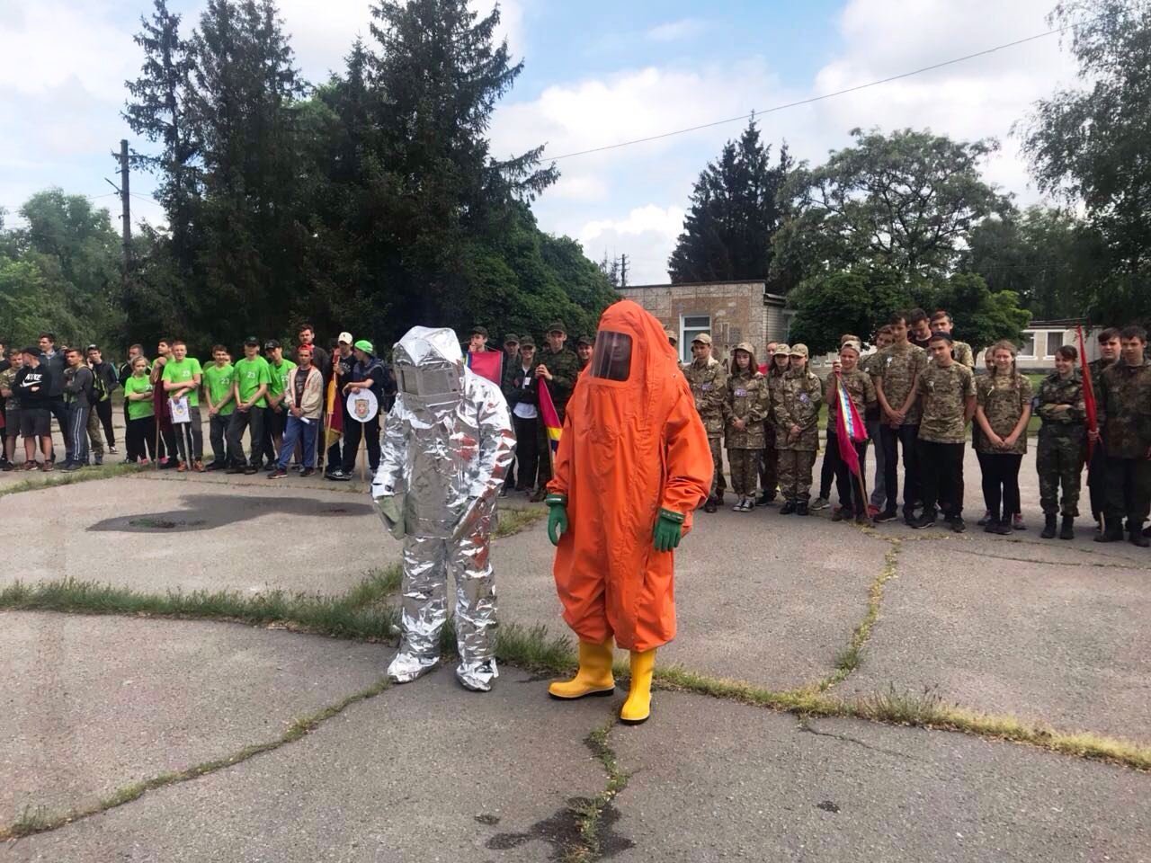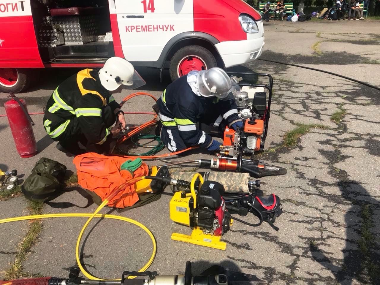 Продемонстрировали химические костюмы, аппараты на сжатом воздухе. Показали в работе гидравлический инструмент, с помощью которого разрезают металлические предметы, решетки, автомобили и тому подобное.