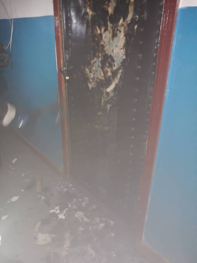 Огнем уничтожено облицовку дверей, телекоммуникационный кабель, повреждена облицовка стен на площади 1,5 кв. м, закопчены стены и потолок на площади 15 кв. м.