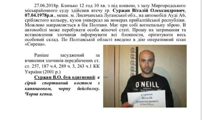 Напомним, что разыскиваемый - 40-летний Суржан Виталий Александрович, уроженец Лисичанска, Луганская область, сбежал 27 июня из зала Миргородского районного суда. В области ввели план «Сирена».