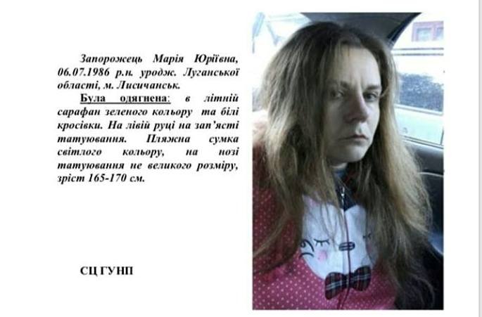 Его спутница - 31-летняя Запорожец Мария Юрьевна, также уроженка Лисичанска, была одета в летний сарафан зеленого цвета и белые кроссовки. На левом запястье и ноге татуировки. С собой пляжная сумка светлого цвета.