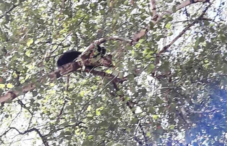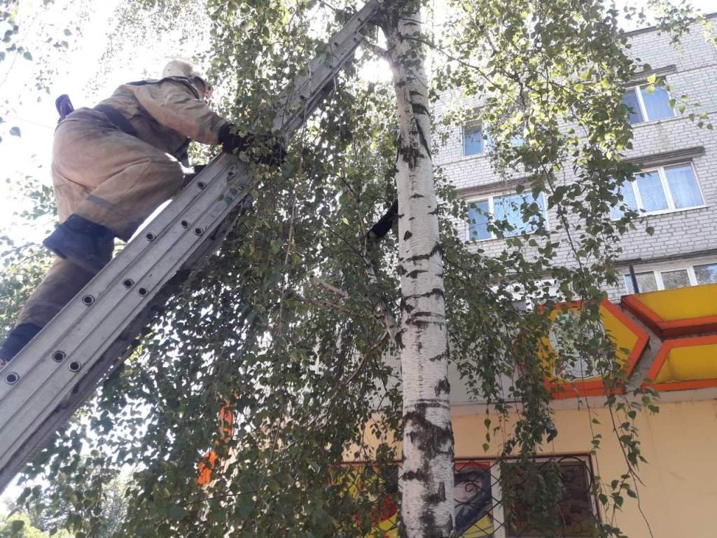 Животное не смогло спуститься самостоятельно, поэтому местные жители обратились за помощью к пожарным. По лестнице спасатели поднялись на дерево и сняли кота.