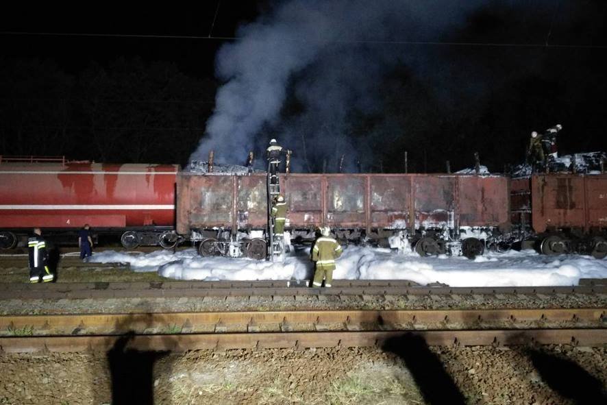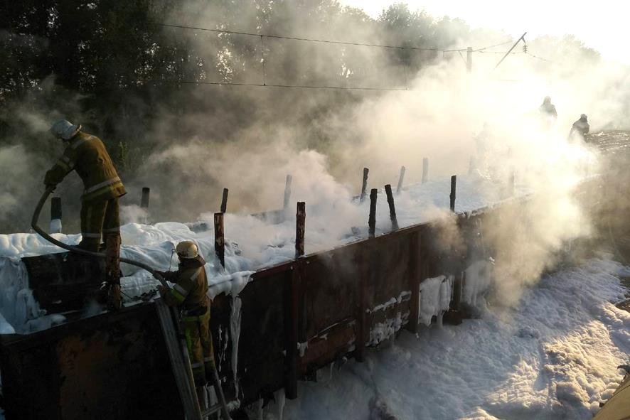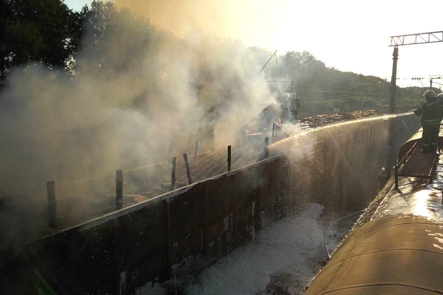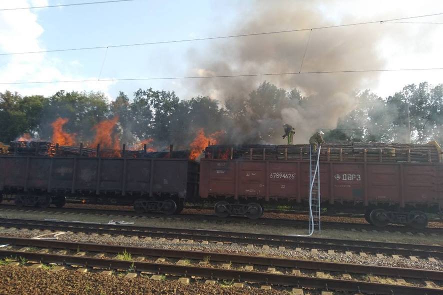 Вогонь знищив лісоматеріал в одному вагоні та частину лісоматеріалу в іншому. Збитки та причина пожежі встановлюються.