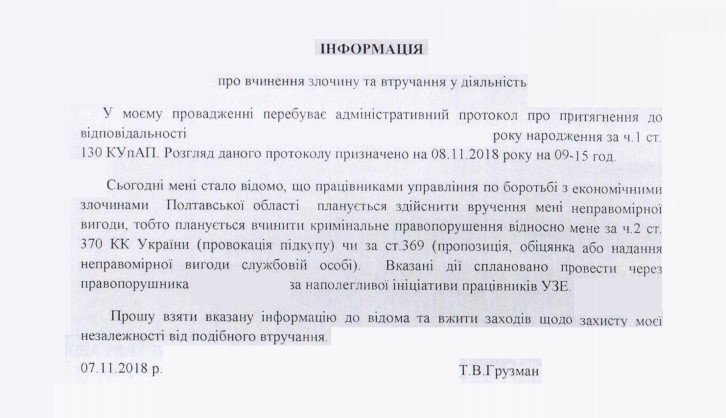 У своєму листі суддя написала, що в неї на розгляді перебуває провадження за ст. 130 КУпАП (керування ТЗ у стані сп’яніння). Працівники управління по боротьбі з економічними злочинами Полтавської області через правопорушника планують вручити їй неправомірну вигоду, вчинивши відносно неї кримінальне правопорушення, передбачене ч.2 ст. 370 (провокація підкупу) чи ст.369 (пропозиція, обіцянка або надання неправомірної вигоди службовій особі).