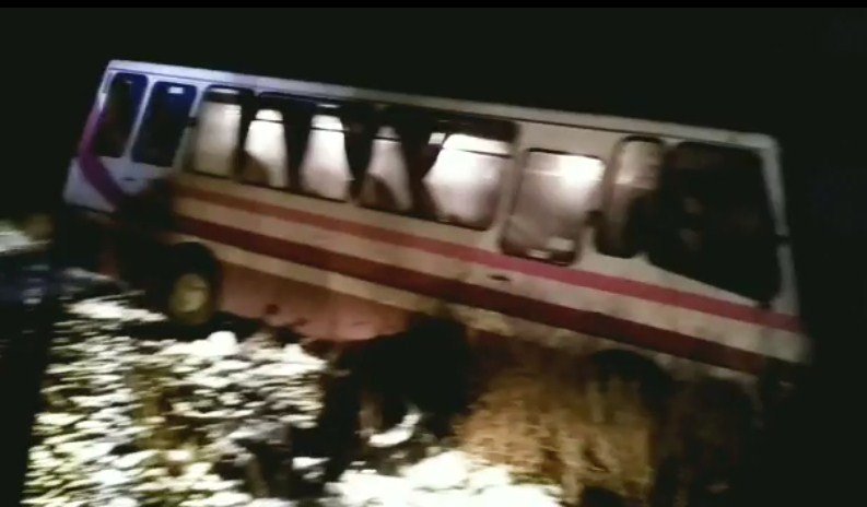Автобус помогали вытаскивать назад на дорогу спасатели.