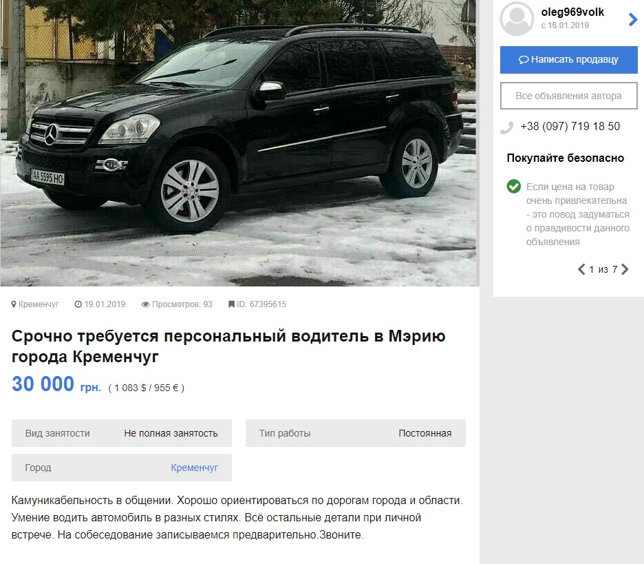 «Терміново потрібний персональний водій в мерію міста Кременчук. 30 000 грн».
