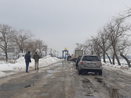 На переїзді Кременчуцької ГЕС зупинився транспорт – їдуть лише легковики, якщо «протиснуться» між вантажівками. За інформацією очевидця, вантажним машинам важко проїхати по слизькій дорозі, переїжджати горби та колії. Тому вони зупинилися.