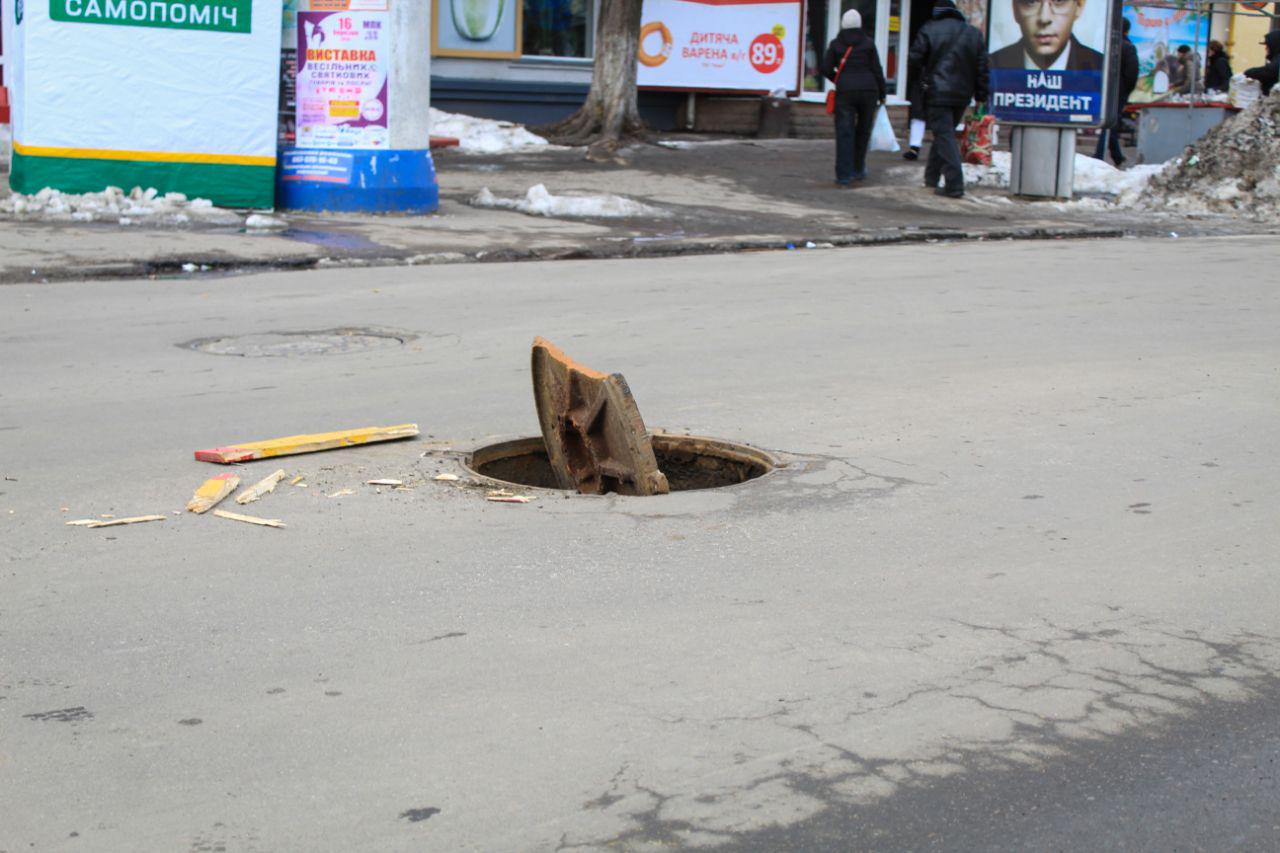 В Кременчуге на ул. Небесной сотни «открылся» люк. Прямо посреди дороги в районе остановки «Центральный рынок» обломалась крышка люка.