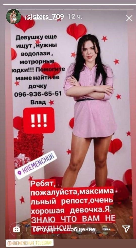 Зниклу дівчину звати Каріна. За інформацією керівника водної поліції Кременчука Олега Стешенка, станом на вечір 30 березня провели обстеження близько 30 га поверхні акваторії Дніпра та прибережної зони, також водолази обстежили близько 6000 квадратних метрів дніпровського дна. Пошукові роботи будуть відновлені 31 березня, орієнтовно з 10:00.