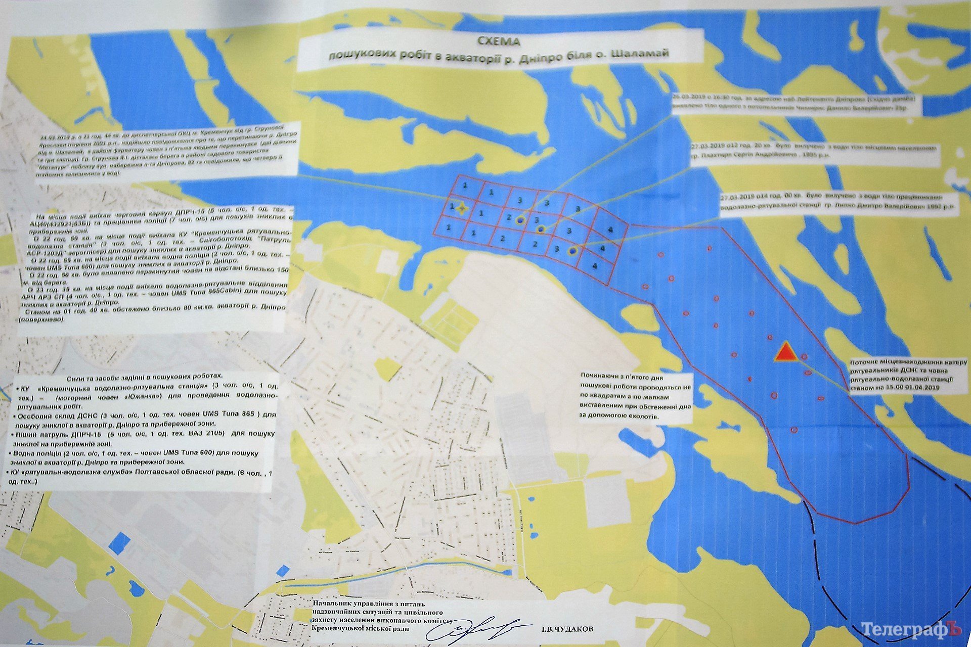 Начальник рятувально-водолазної станції Василь Білоус розповів про роботу водолазів з початку пошуків. За його словами, двоє водолазів постійно перебували у воді. Вони працюють на глибині від 8 до 10 метрів, де повна темнота. Крім того, іноді на Дніпрі спостерігається велика течія, до 1 метра за секунду.