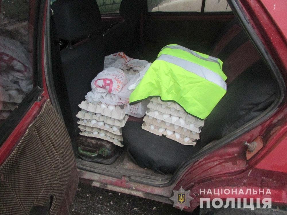 Крім водія, у машині перебував пасажир. Також у салоні легковика поліцейські виявили 34 лотки з яйцями, що транспортувалися без відповідної накладної. За інформацією ГУ Нацполіції у Полтавській області, 33-річний пасажир поцупив з місцевої птахофабрики 1 011 яєць. Чоловік не став заперечувати своєї причетності до злочину.