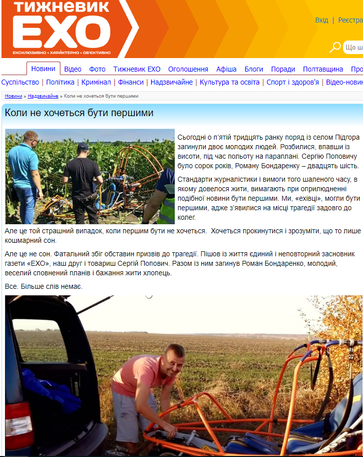 За інформацією сайту тижневика «Ехо Кобеляк», внаслідок аварії загинув засновник-видавець газети «Ехо Кобеляк» Сергій Попович.