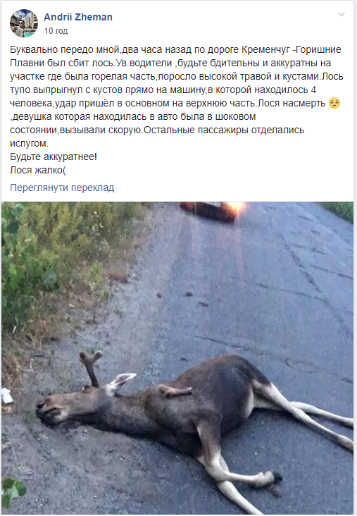Увечері 7 липня на дорозі Кременчук – Горішні Плавні машина збила лося. Про відповідний інцидент повідомив очевидець Андрій у групі «Мої Горішні Плавні».