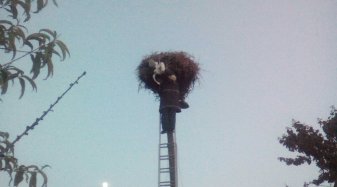 У дворі місцевого жителя знаходиться гніздо, в якому й заплутався птах. Заі інформацією міськрайонного управління ДСНС, рятувальник за допомогою драбини зняв птаха з гнізда. Лелеку передали ветеринарам.