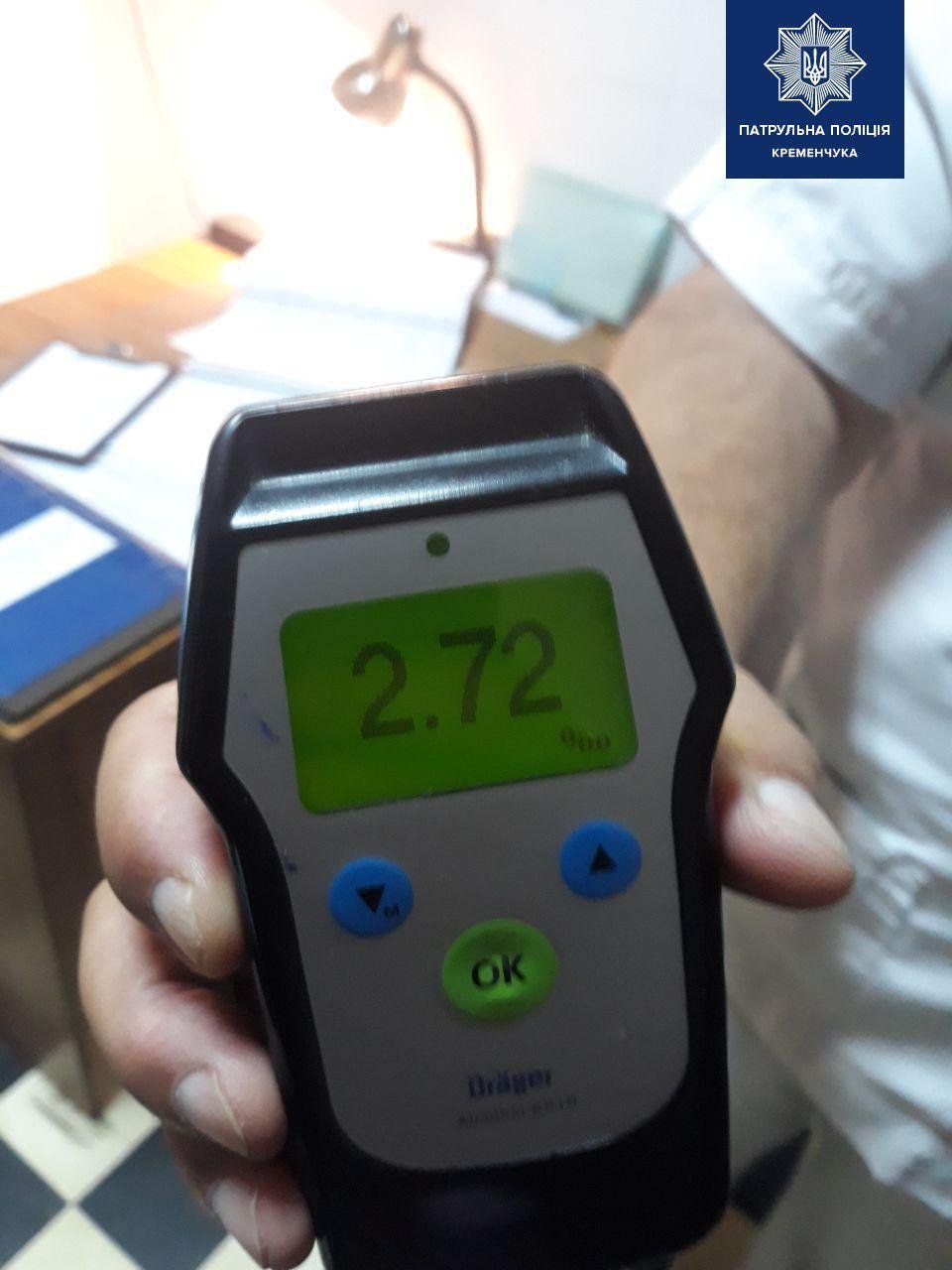 Водій «надув» на 2,72 проміле, при гранично допустимих 0,2. Правоохоронці склали відповідні матеріали: протокол затримання та протокол за ст.130 КУпАП (керування транспортними засобами або суднами особами, які перебувають у стані алкогольного, наркотичного чи іншого сп’яніння або під впливом лікарських препаратів, що знижують їх увагу та швидкість реакції). Викликали адвоката.