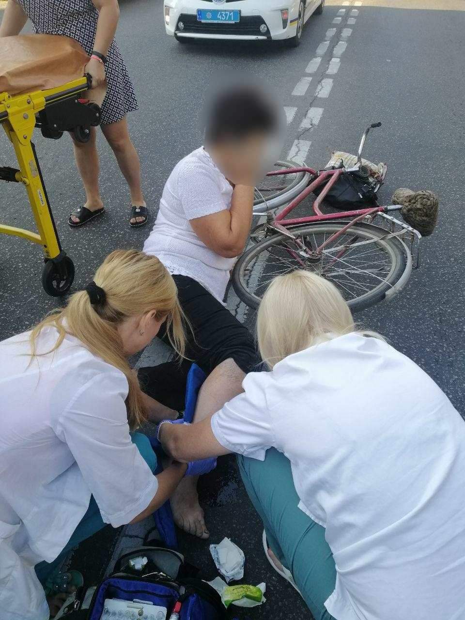 У водійки двоколісного транспорту підозра на перелом ноги. Правоохоронці встановлюють обставини ДТП. За попередніми даними, винна велосипедистка: жінка вела велосипед через дорогу у не встановленому місці.