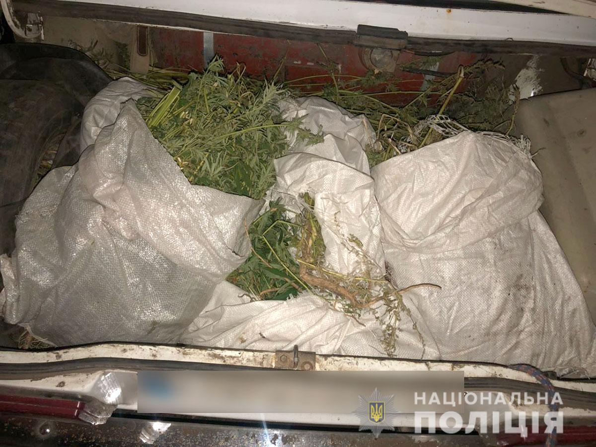 На місці події слідчо-оперативна група задокументувала факт наявності в багажному відділенні автівки 6 мішків з верхівками та листям рослин, схожих на канабіс. 25-кг вилученої речовини направили на експертне дослідження.