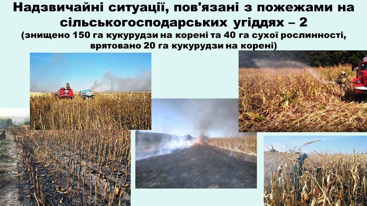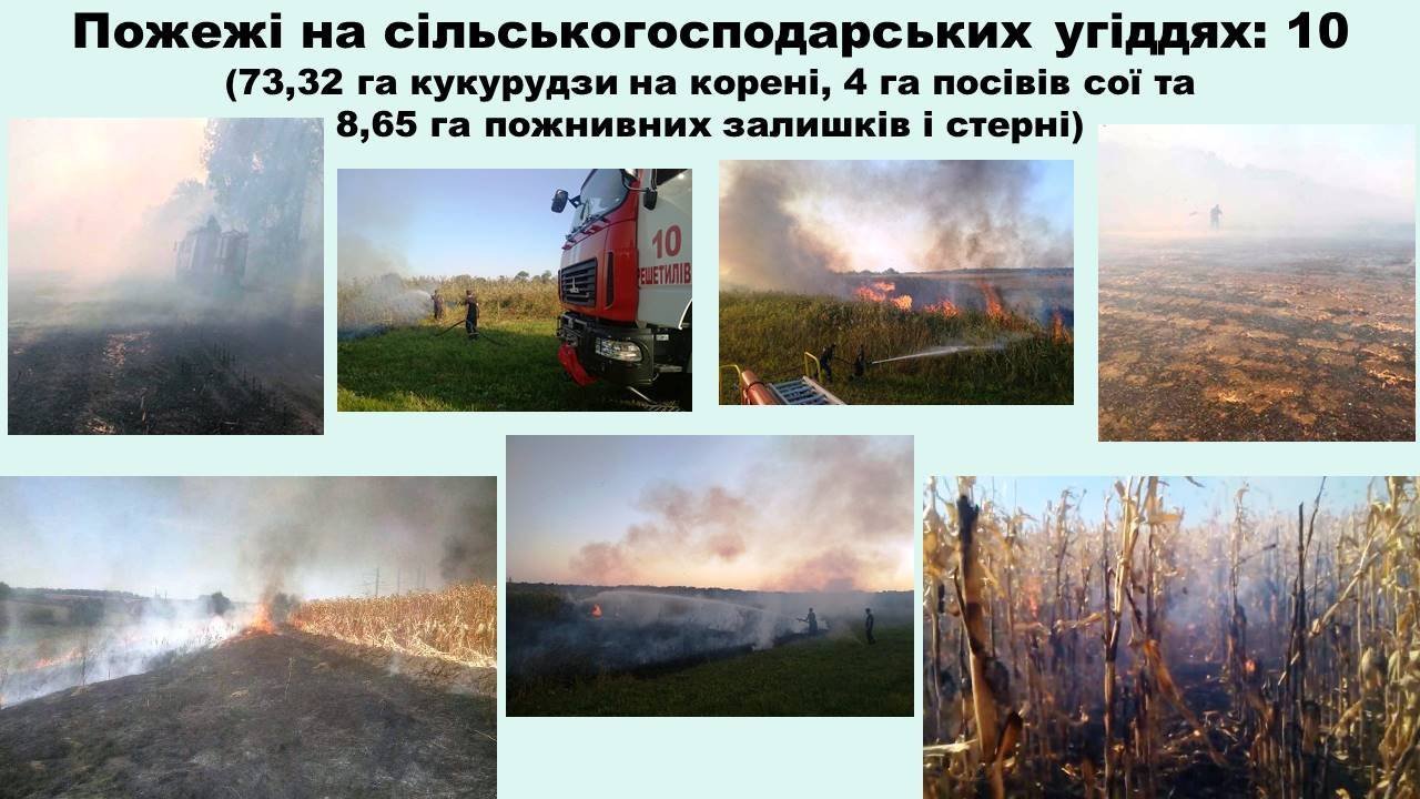 Також у вересні на території області сталися дві надзвичайні ситуації природного характеру – пожежі на сільськогосподарських угіддях поблизу Березової Луки, що на території Петрівсько-Роменської об’єднаної територіальної громади, і Абрамівки Машівського району. Вогонь знищив два кукурудзяні поля. Внаслідок пожеж були завдані збитки на суму, яка відповідає надзвичайній ситуації регіонального рівня.