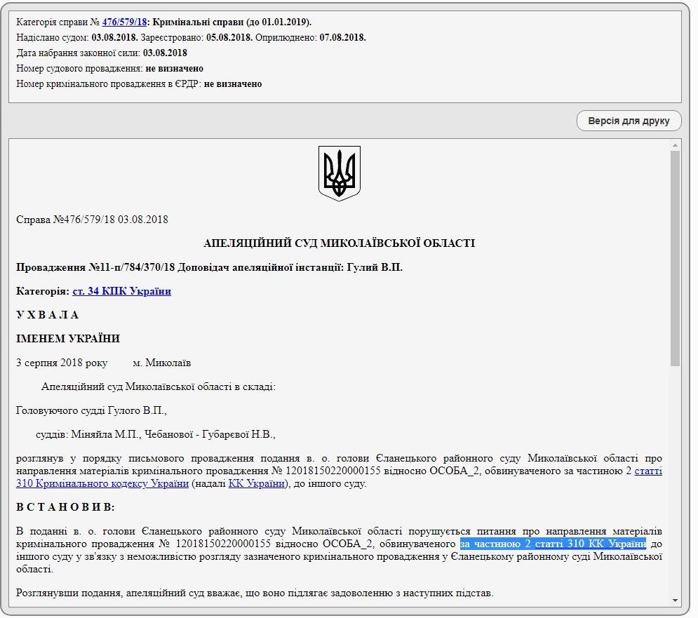 Як видно з Єдиного державного реєстру судових рішень, кримінальне провадження все ж перекваліфікували на ч.2 ст. 310 ККУ. Такий висновок можна зробити з ухвали Апеляційного суду Миколаївської області.