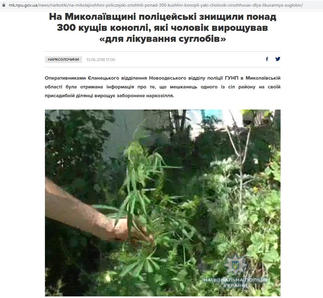 16 червня 2018 року на сайті Національної поліції в Миколаївській області з'являється стаття з таким заголовком: «На Миколаївщині поліцейські знищили понад 300 кущів коноплі, які чоловік вирощував «для лікування суглобів».