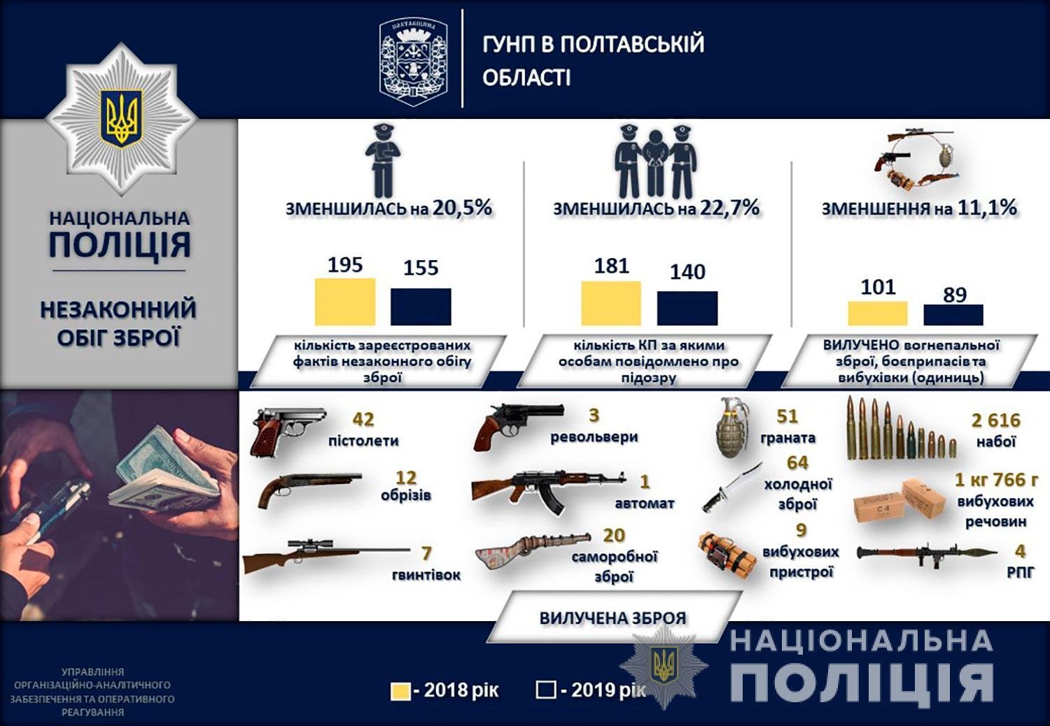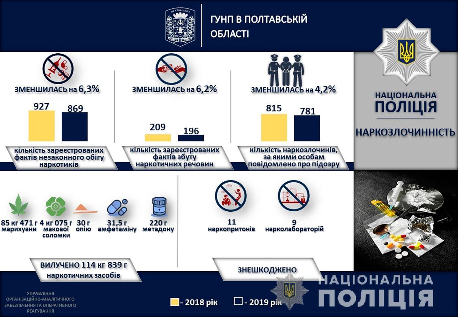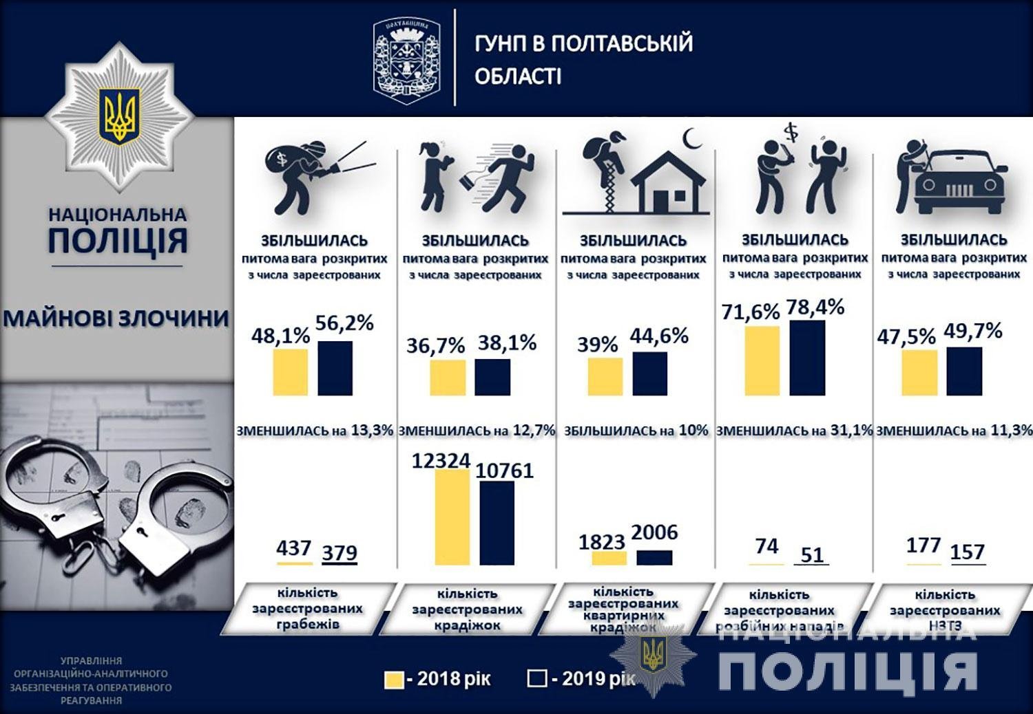 Загальна кількість злочинів на Полтавщині у 2019 році зменшилася майже на 12%. Про це розповів начальник поліції Полтавської області Андрій Замахін на звітній пресконференції, що відбулася в Головному управлінні поліції області.