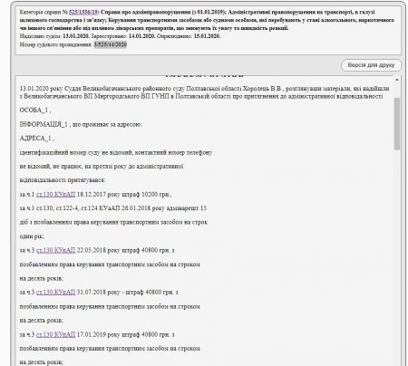 У тексті постанови йдеться, що протокол на чоловіка склали 16 листопада 2019 року. Правоохоронці виявили нетверезого водія в селі Степанівка Великобагачанського району. Перевіряти вміст алкоголю в крові чоловік відмовився.