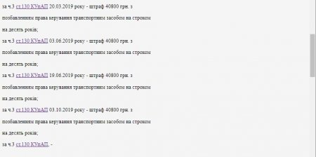 Згідно з інформацією з постанови, перший запис про штраф за нетверезе водіння зафіксований 18 грудня 2017 року. Тоді чоловіка покарали на 10 тисяч гривень.