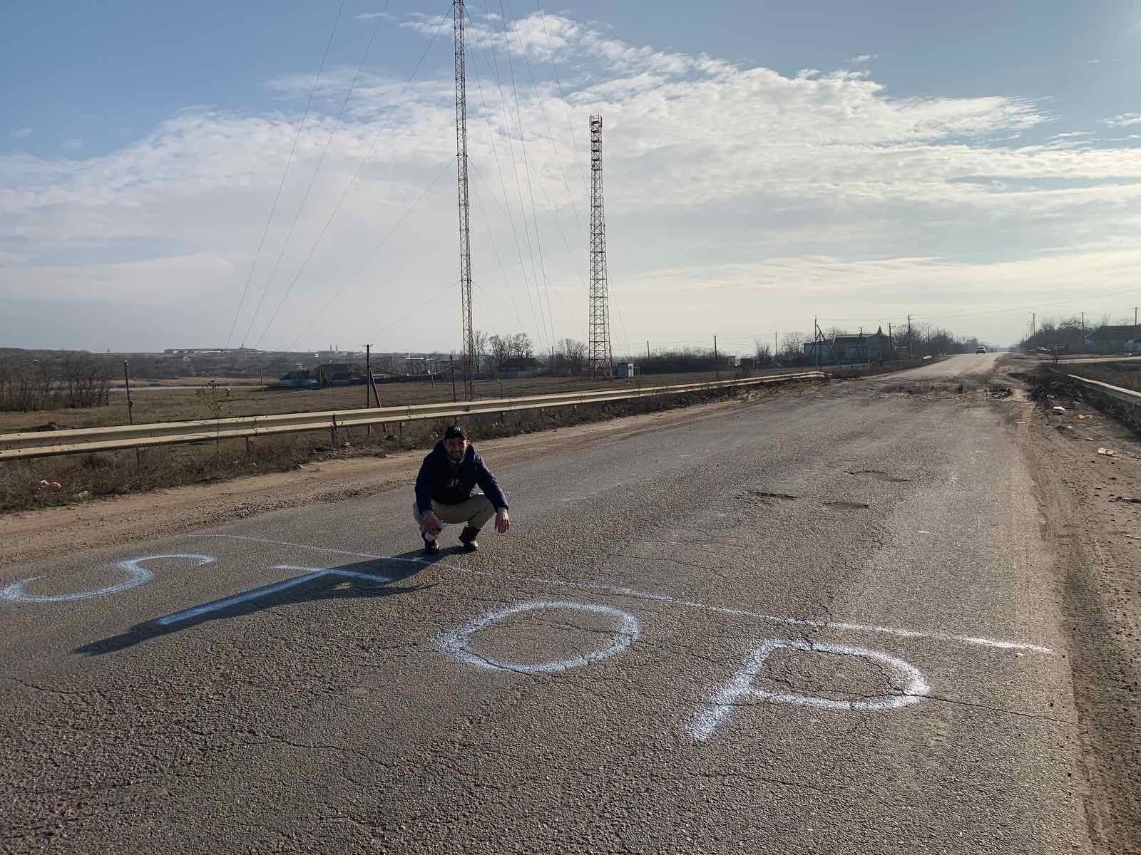 Кременчужанин Віталій за допомогою аерозольного балончика попередив інших водіїв про небезпеку на дорозі. Чоловік намалював на відрізку дороги Кропивницький – Херсон слово «Stop». Така розмітка має попередити керманичів про ями, що «чатують» далі.