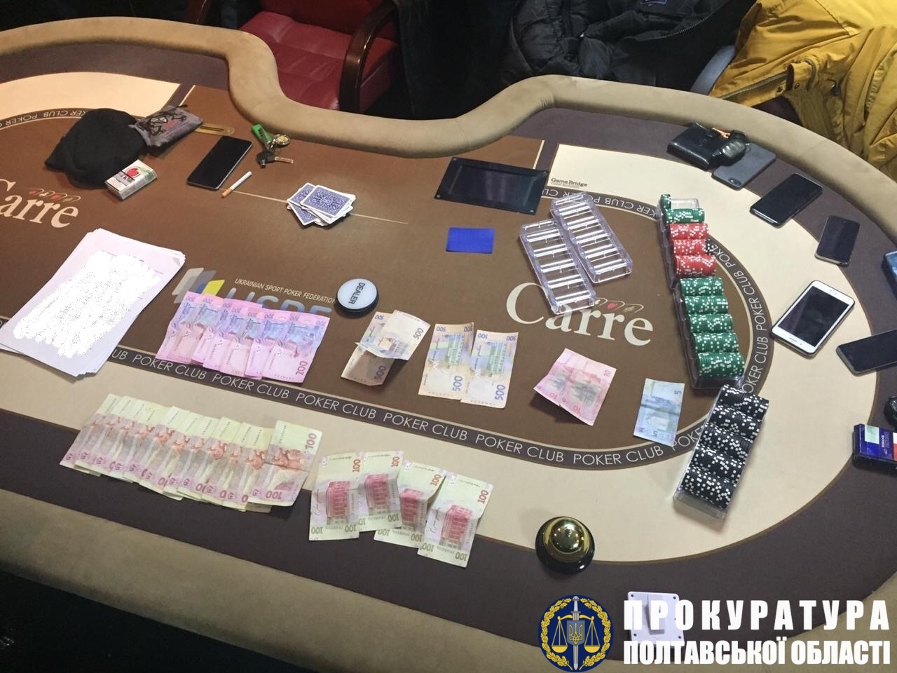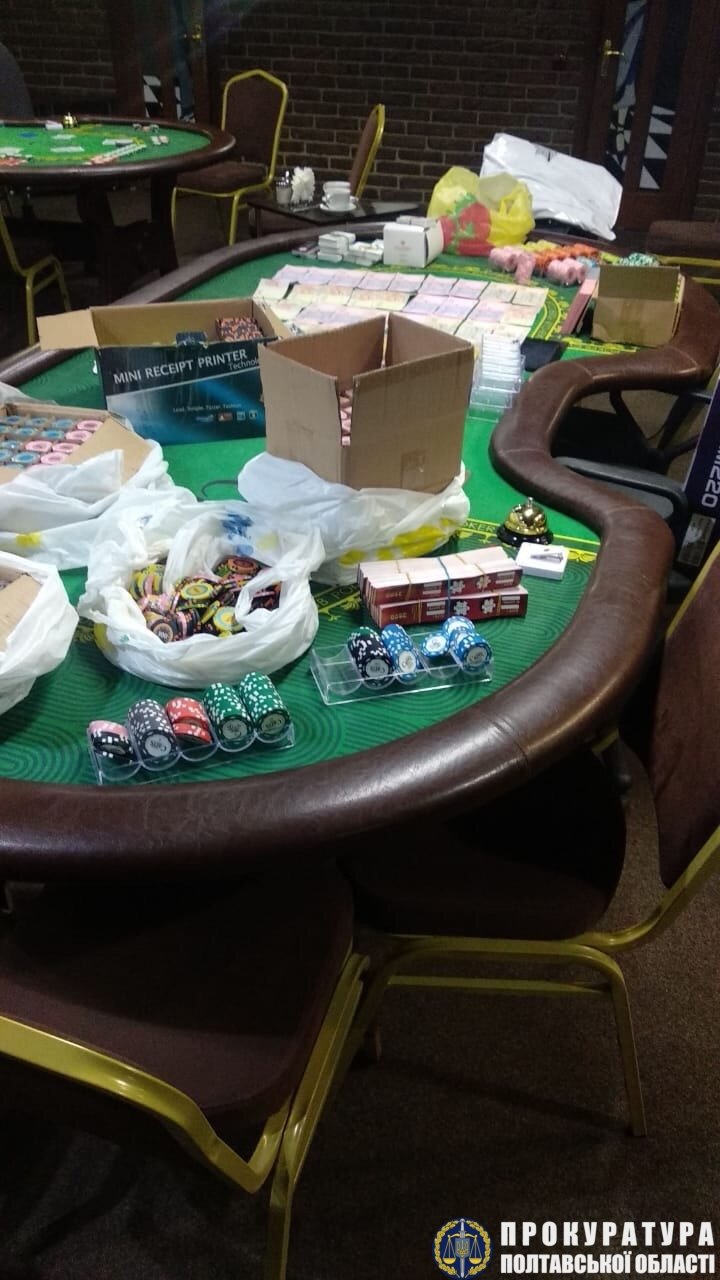Під час одночасних обшуків у гральних закладах Полтави і Кременчука та за місцем проживання осіб вилучено 6 покерних столів, більше 14 тисяч ігрових фішок, з яких кеш-фішок на загальну суму понад 5 млн грн, ноутбуки, мобільні телефони, системи відеонагляду та 125 тис грн.