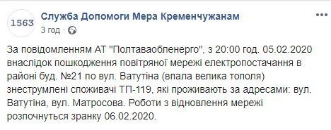 Зокрема через падіння великої тополі без електроенергії залишилися мешканці вулиць Ватутіна та Матросова. Про це інформує відділ оперативного контролю за станом у місті виконкому.