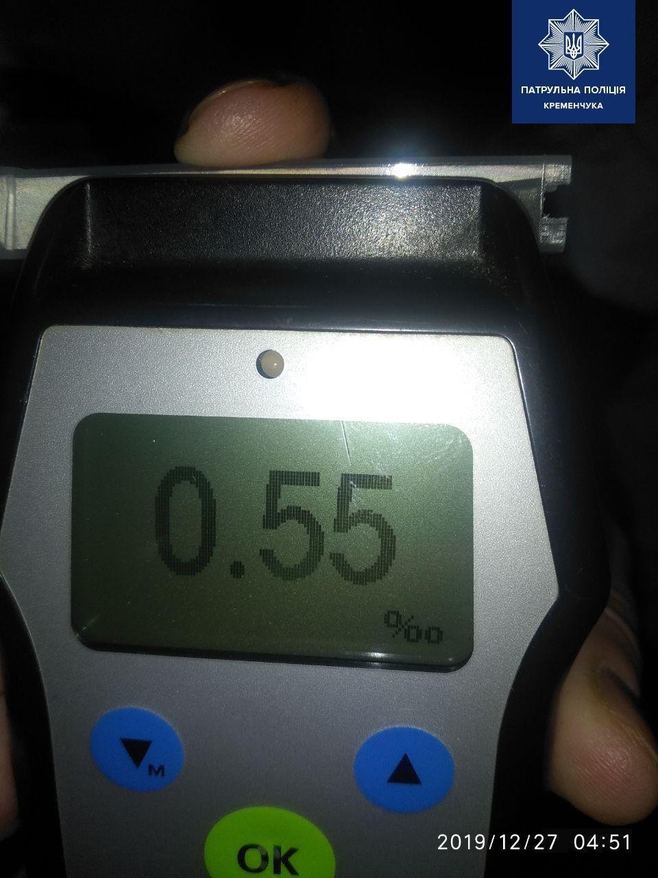 Наступного разу п’яного водія зупинили вночі 27 грудня на вулиці Кондратюка. Саме тоді і стався «кусючий» інцидент. Чоловіка перевірили в наркодиспансері. За інформацією патрульної поліції Кременчука, результат був на рівні 0,55 проміле (допустима норма – 0, 2 проміле).