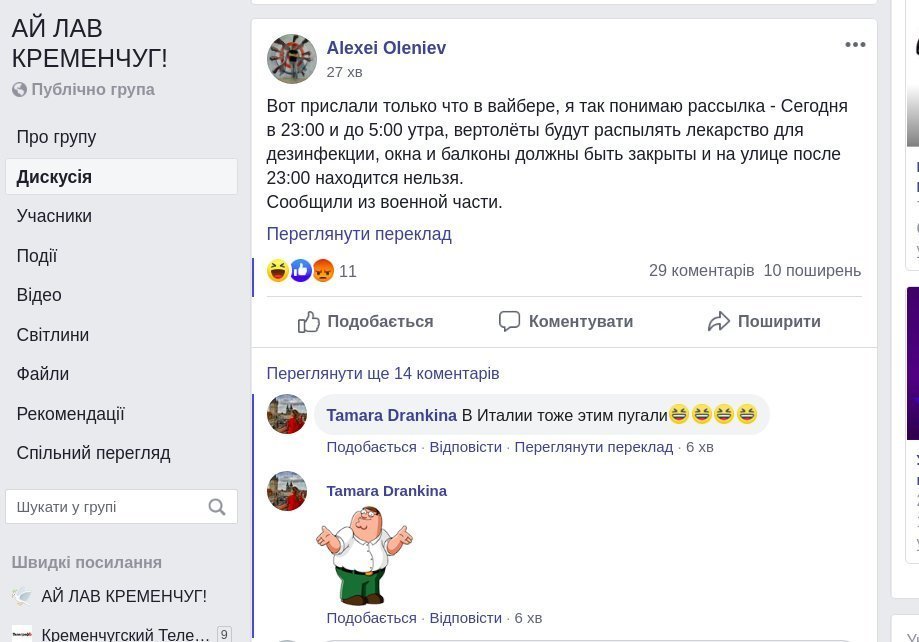 Сьогодні увечері, 16 березня, у соцмережах серед кременчужан почали ширити інформацію про дезінфекцію міста з повітря. Посилаючись на інформацію з військової частини, повідомляють, що в ніч на 17 березня вертольоти будуть розпилювати засіб для дезінфекції. Вікна та балкони рекомендують зачинити.