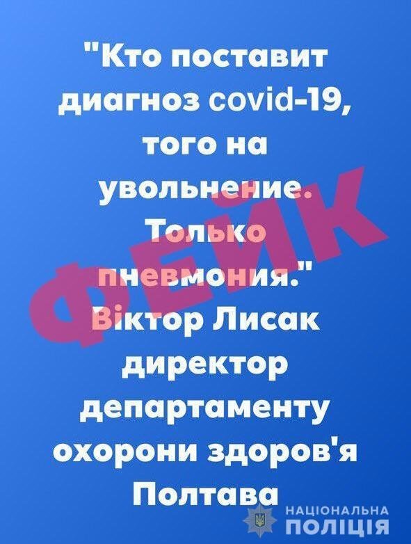 Наприклад, начебто директор Департаменту охорони здоров’я Полтавської ОДА Віктор Лисак забороняє медикам ставити діагноз COVID-19, за це звільнятимуть: