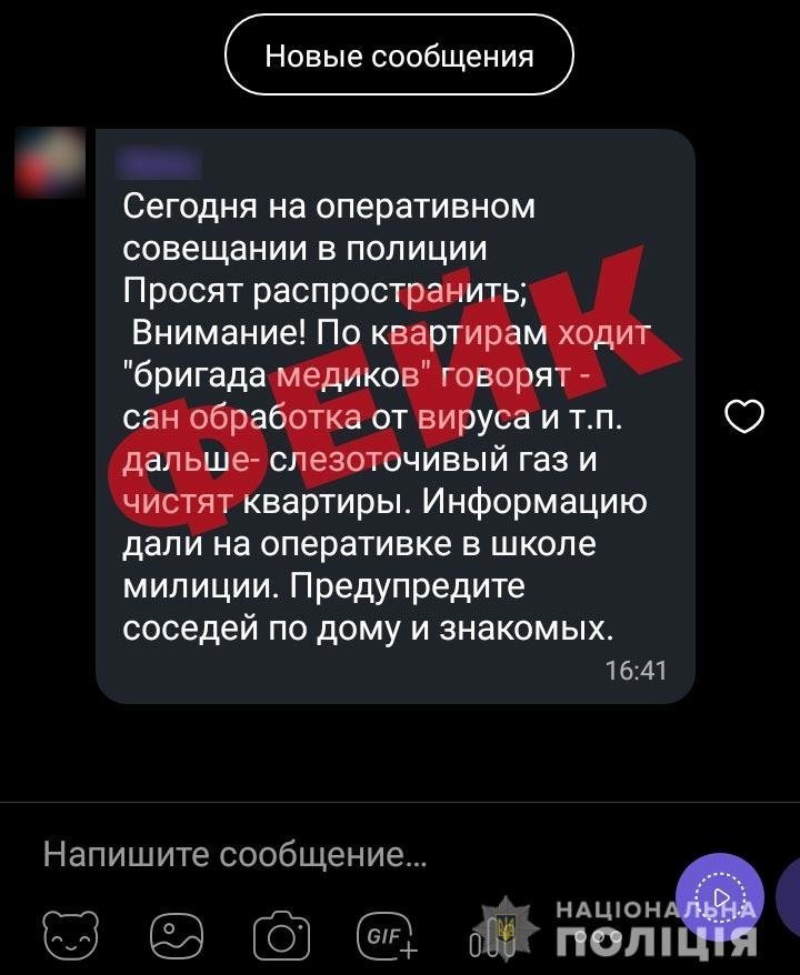 Або ось, про те, що по квартирах ходить «бригада медиків», які під приводом санітарної обробки від вірусів застосовують сльозогінний газ та грабують: